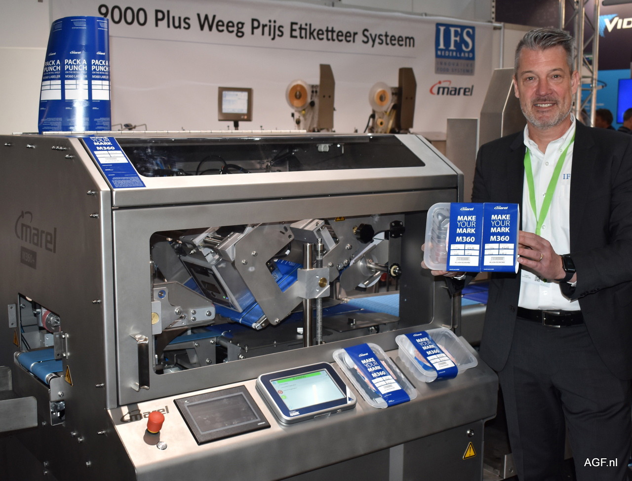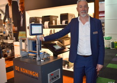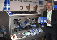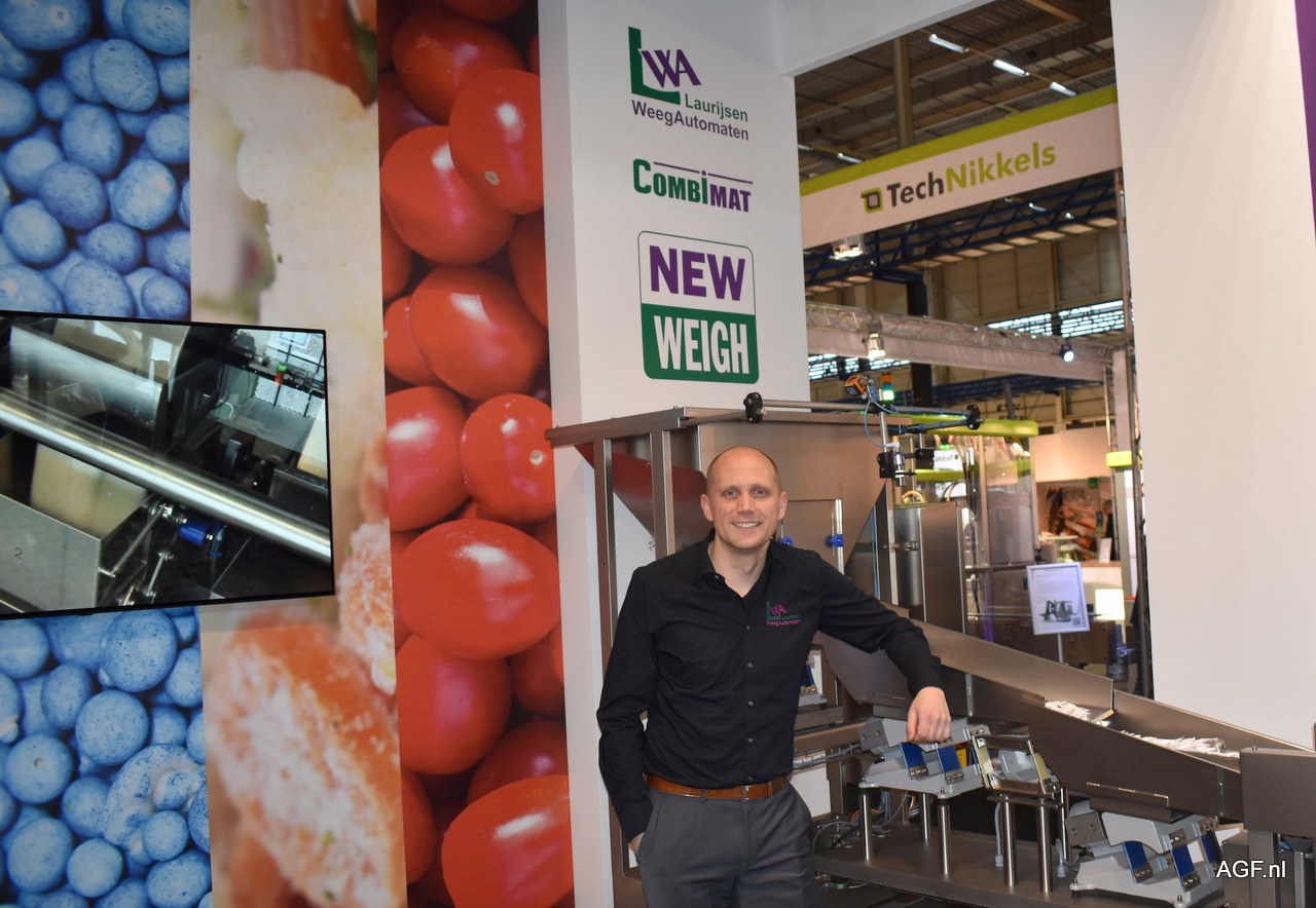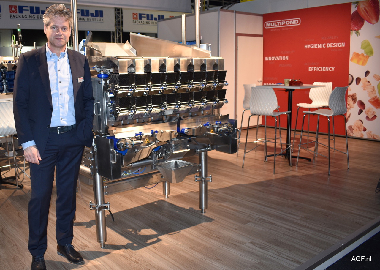 Frank Caris van Multipond. Naast hem de MPL 008 1000-400 J weegautomaat voor vers gesneden groenten en fruit in kleinere gewichten. Het is een lage machine met weinig valhoogte. Ook is er geen hoog bordes nodig en is de machine goed te reinigen.