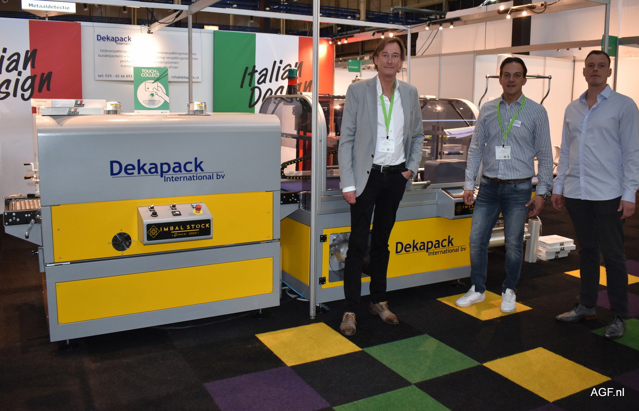 Dekapack. Harro Truffino, Arjan Kuiper en Nick Vlaming. Leverancier van vormschoudermachines en krimpfolietunnels van het merk Imbalstock. De machine kan bv worden gebruikt voor het sealen van komkommers. Producten kunnen ook begast worden. De machine beschikt over een meelopend stempel zodat een doorlopende sealbeweging ontstaat. Ook RVS uitvoeringen zijn mogelijk.