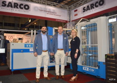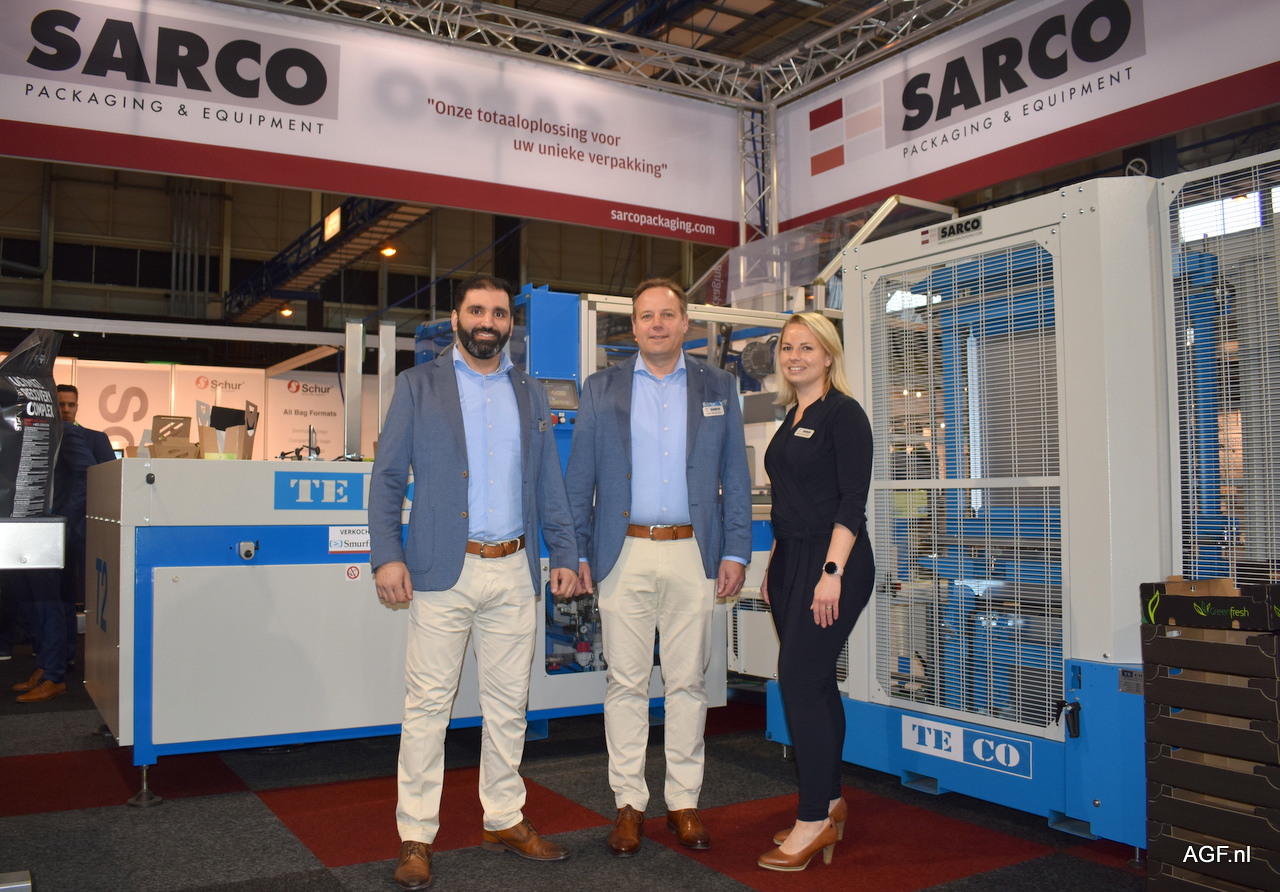 Wahid Payanda, Jaap van der Sar en Simone van Kuijk van Sarco. Zij poseren bij een TeCo trayopzetter en stapelaar. Trays worden automatisch gestapeld.