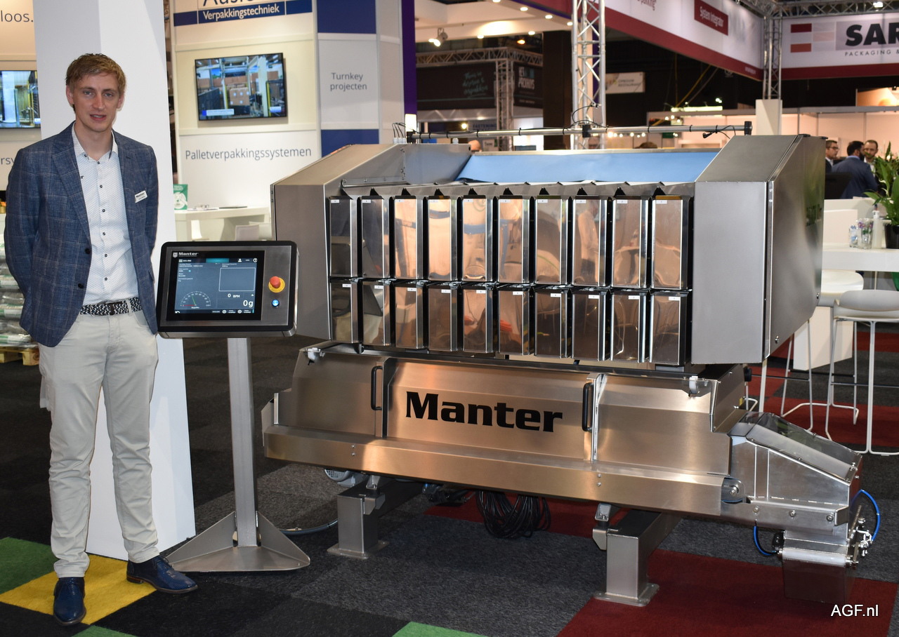 Jarno Habing van Manter met naast hem de nieuwe 10 baks weegmachine M10iDS. De ‘s’ in de typeaanduiding staat voor ‘small’ omdat de machine in twee type bakken geleverd kan worden. De M10i Ds is ontwikkeld voor verpakkingen tussen de 250 en 2.500 gram en de M10i D weegt tussen de 500 en 5.000 gram. De machine haalt 55 slagen per minuut. Om dat te bereiken is de machine uitgevoerd met doseerbuckets. Door beperkte valhoogtes is de machine productvriendelijk. Het geheel valt goed te reinigen door afneembare bakken.