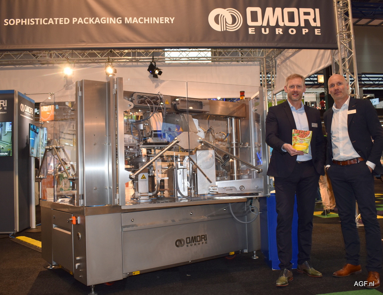 Erwin Middelhoff en Marc Arends van Omori Europe. De machine naast hen is een Leepack die kan vullen, begassen, sealen en labelen van Doybag en flatbottompouche. In deze verpakkingen worden soepen, sauzen, vloeistoffen, bonen etc, verpakt. Waar vroeger veel in glas ging komen deze verpakkingen er steeds meer voor in de plaats.