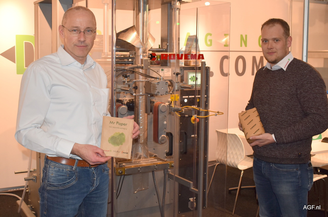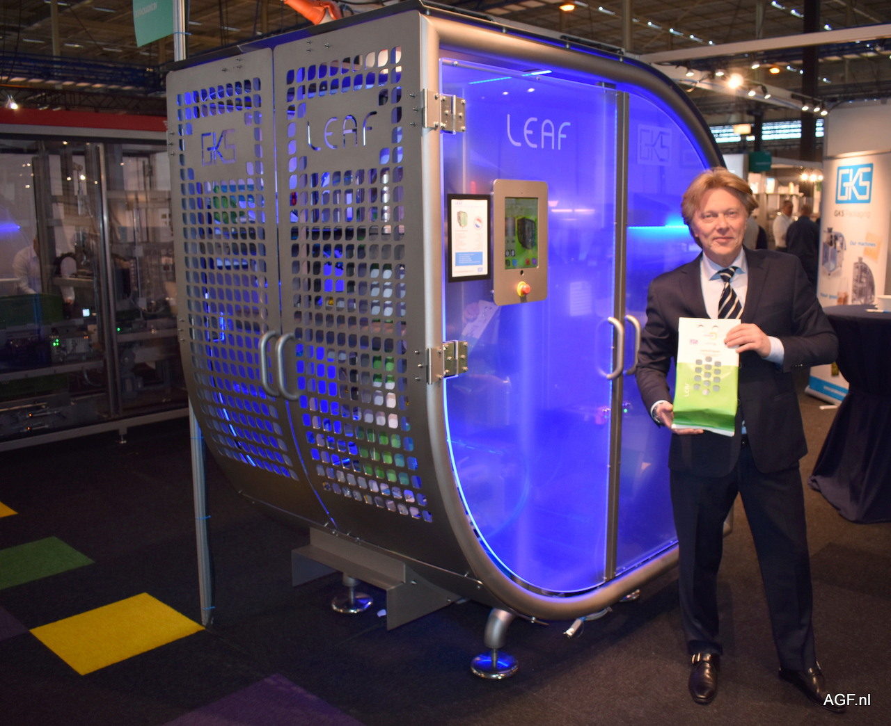 Han Geels van GKS. Hij laat een papieren zak zien die gemaakt is door de Leaf. Een machine die papieren zakken op de rol vewerkt tot een fraaie AGF verpakking. De machine wordt momenteel in de aardappelsector gebruikt. De papieren zak wordt door de machine van stansgaten voorzien.