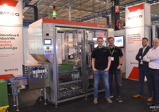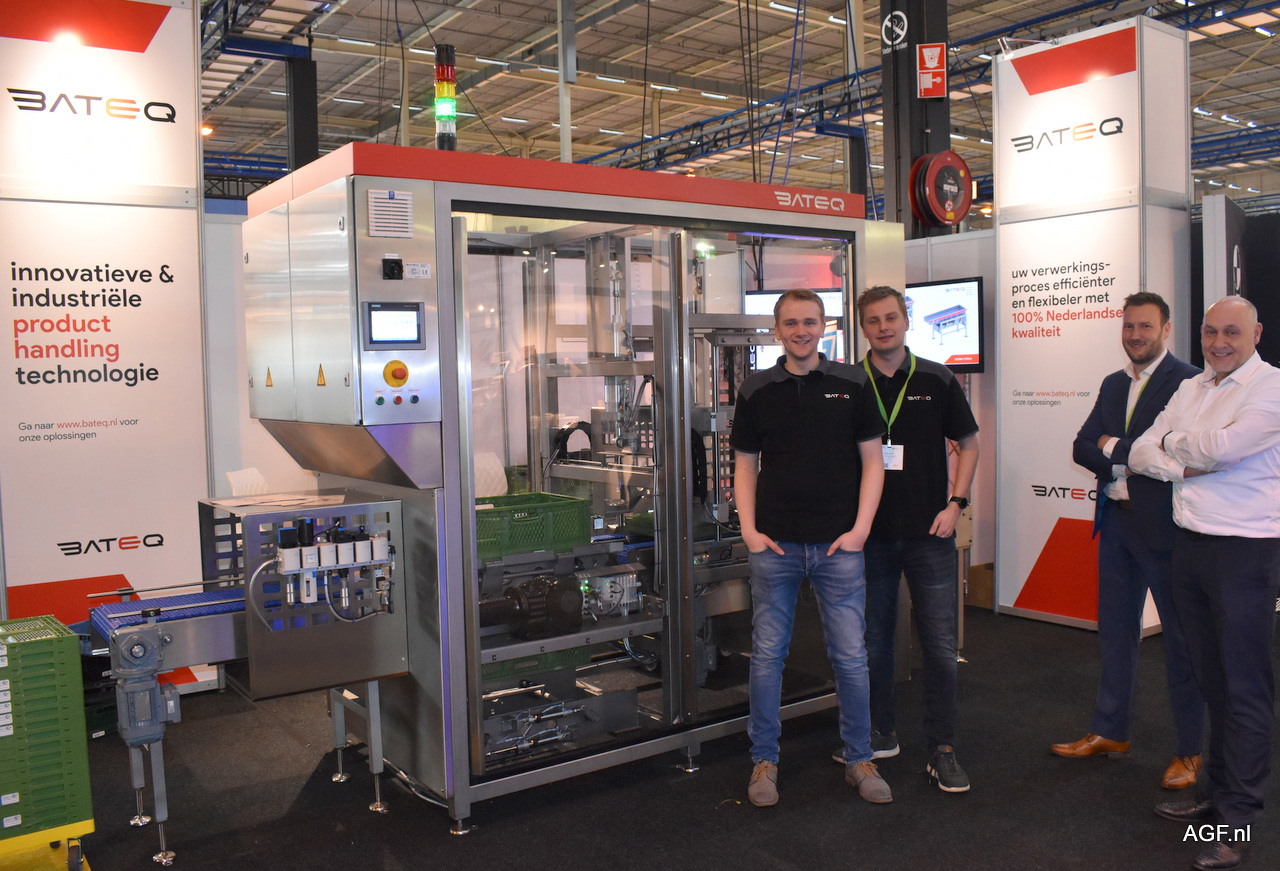 Bateq, Justin Markvoort, Stefan Willems, Rob Grootens en Andre ter Braake. De machine is een klapkratten ontstapelaar en vouwt de kratten automatisch open.