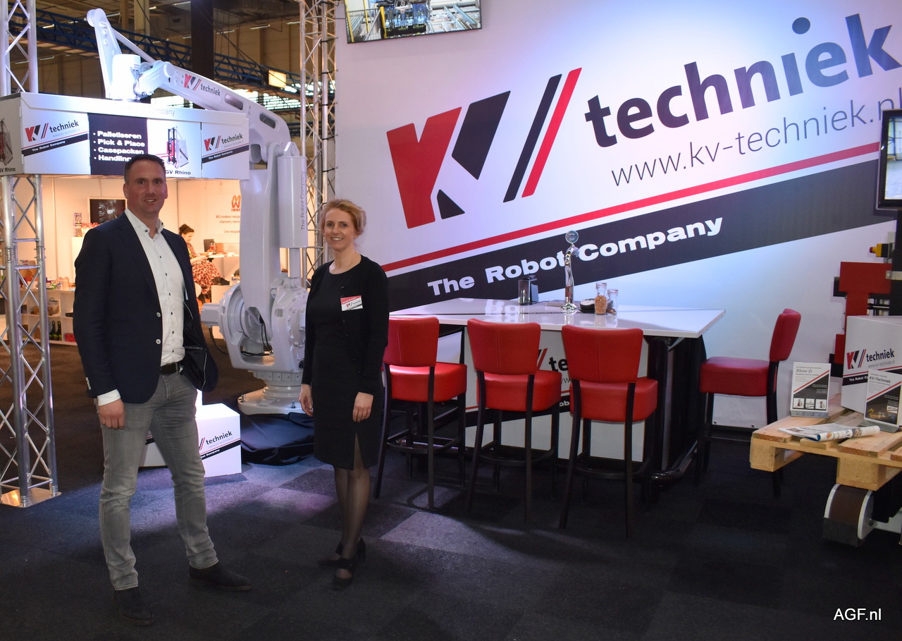 KV Techniek, Martine Verweyen en Bastiaan Krijger. KV Techniek heeft Robot automatisering en AGV als specialiteit. Met de AGV behoren heftruck bewegingen tot het verleden. De AGV werkt volgens een vast patroon en brengt pallets op de gewenste plek. De industriële robots gaan we in de AGF steeds meer zien. Vooralsnog meer bij de verwerkers en verpakkers van AGF. Het vervangt 'handjes' en gaan 24 uur per dag door.