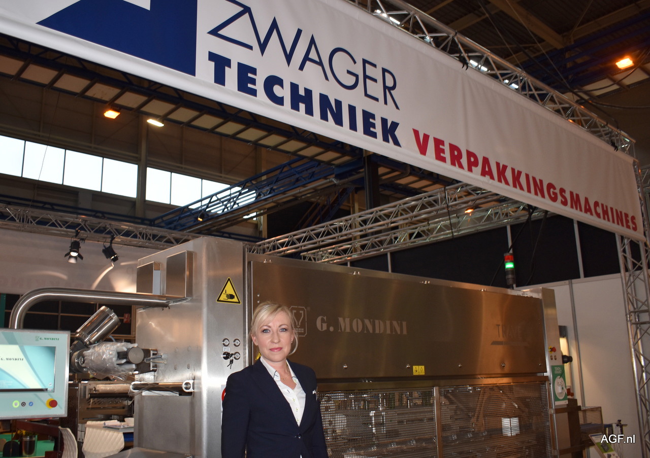 Nicole Jordens van Zwager Techniek. Dit bedrijf is leverancier van G. Mondini topsealmachines. Karton en kunststof worden op deze machine van een topseal voorzien. Voor de AGF is een nieuw type ontwikkeld: de Trave 384 Fresh. Een topsealer met hogesnelheid in een standaard uitvoering die hierdoor dezelfde kwaliteit behoud maar door minder 'toeters en bellen' ook prijstechnisch interessant is voor AGF.