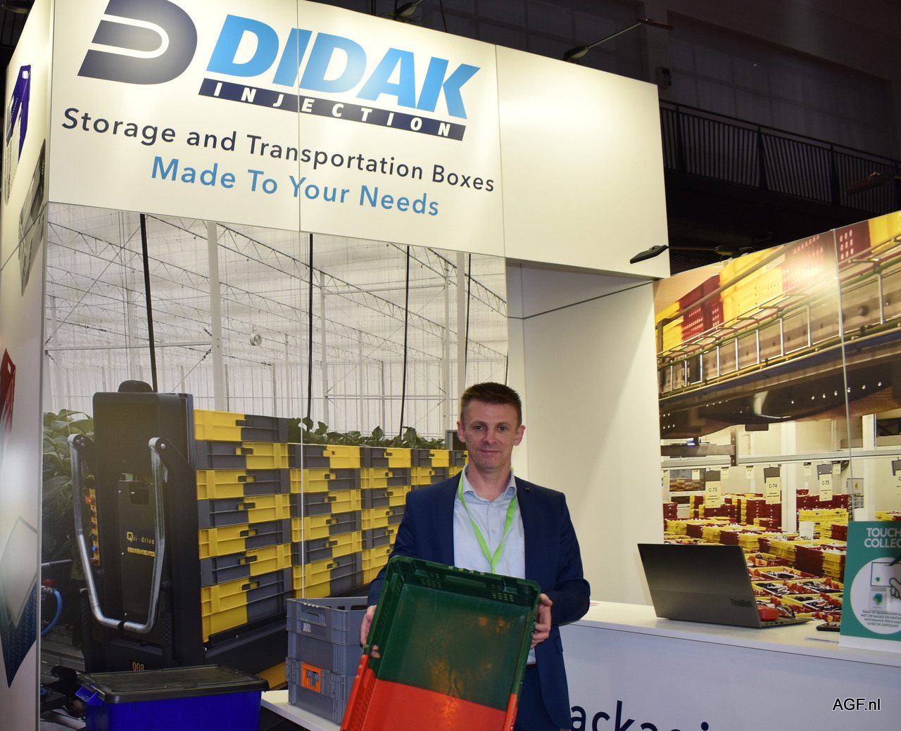 Kurt van Rooy van Didak Injection. Bij dit bedrijf worden spuitgiet producten geproduceerd. Oa. kratten in allerlei soorten, maten en kleuren. De groen/rode kleur is handig bij het stapelen van kratten die maar op 1 manier op elkaar passen.