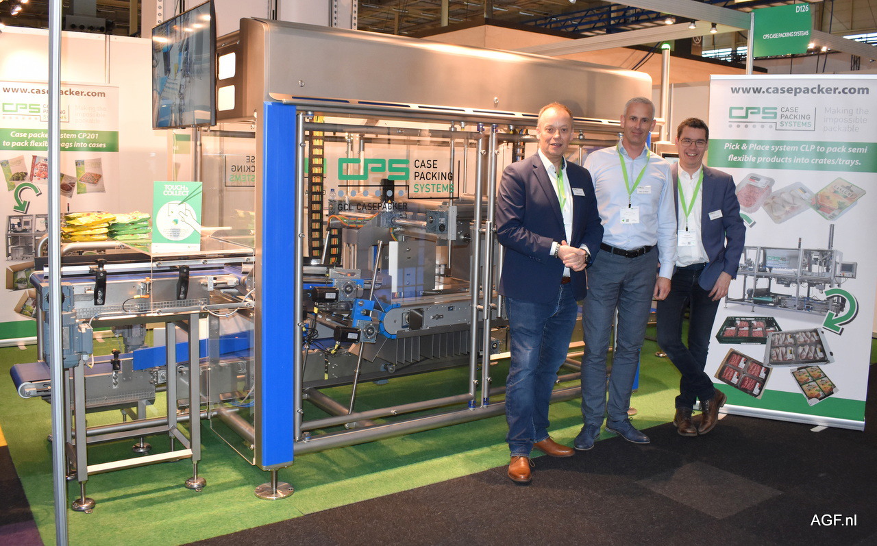 Robert Evers, Marc van Heijzen en Rolph Broens namen op Empack de zaken waar. Hun collega's stonden tegelijkertijd op de Fruit Logistica in Berlijn. Met de Casepacker kunnen zakjes rechtopstaand of liggend in verschillende patronen in omdozen worden verpakt.