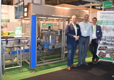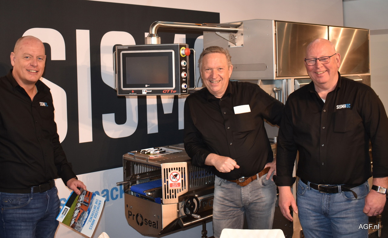 Sismatec stond op Fruit Logistica en Empack. Egbert Roerink, Martin Braamhaar en Gerrit Preuter poserend bij een ProSeal traysealer.