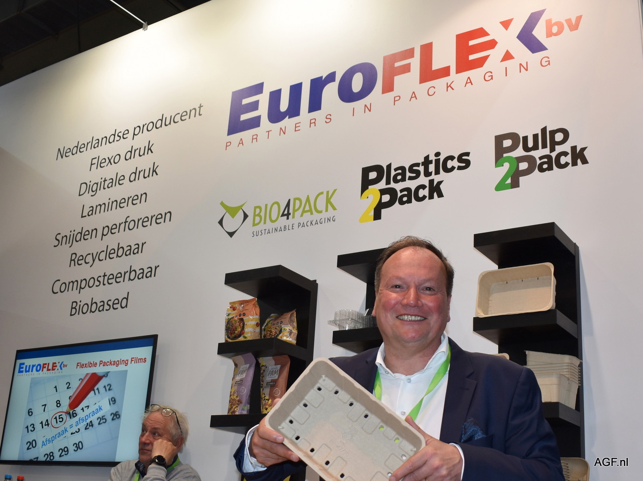 Patrick Gerritsen van Bio4Pack heeft een schaal vast die gemaakt is van rijstafval. Bio4Pack, Euroflex, Plastics2Pack en Pulp2Pack vallen onder de Sylvaphane groep.