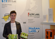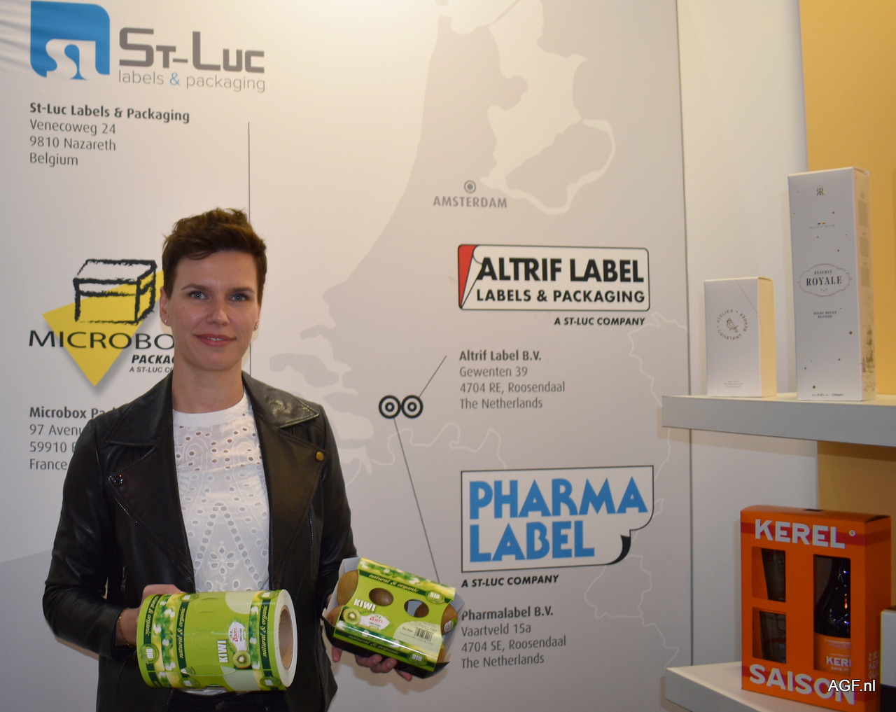 St Luc Labels & Packaging. Friedel Verhack doet de verkoop voor de Belgische markt. Zij toont een Zespri kiwiverpakking voorzien van een sealwrap Ravenwood. De papieren sealwrap vervangt het deksel op de verpakking.