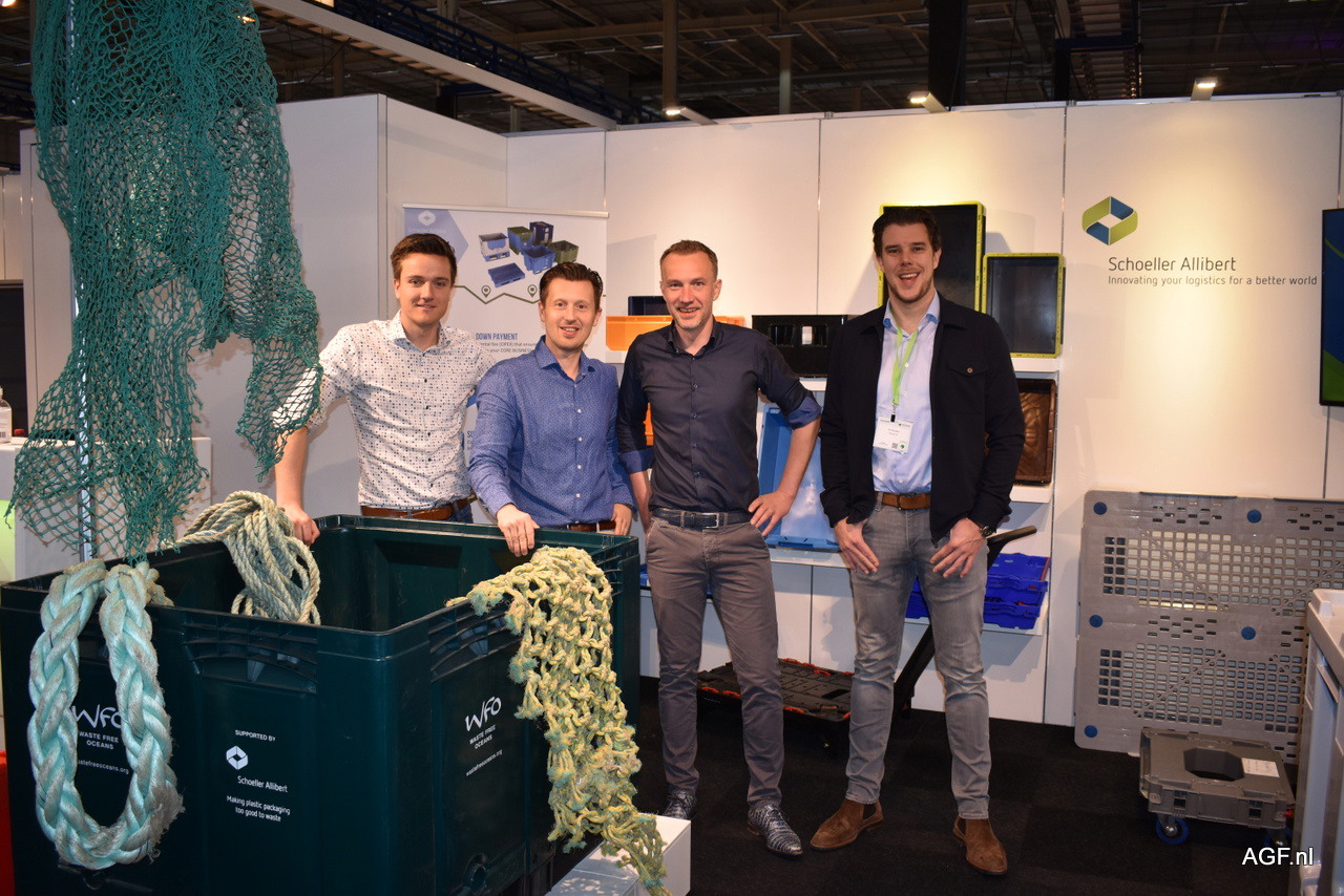 Schoeller Allibert. Lars van der Meer, Dirk Podevijn, Henk Godschalk en Pim Fleurkens. De visnetten benadrukken dat de voorraadkisten voor fruit gemaakt worden op basis van gerecyclede visnetten.