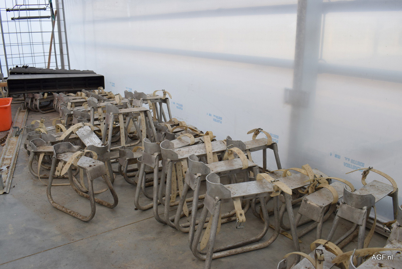 Nee, het zijn geen schaatsen maar stelten. Medewerkers binden deze verhogingen om onder de schoenen om op de juiste hoogte te kunnen werken.