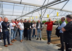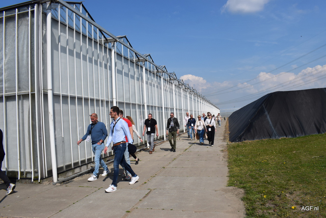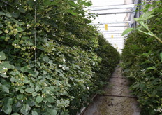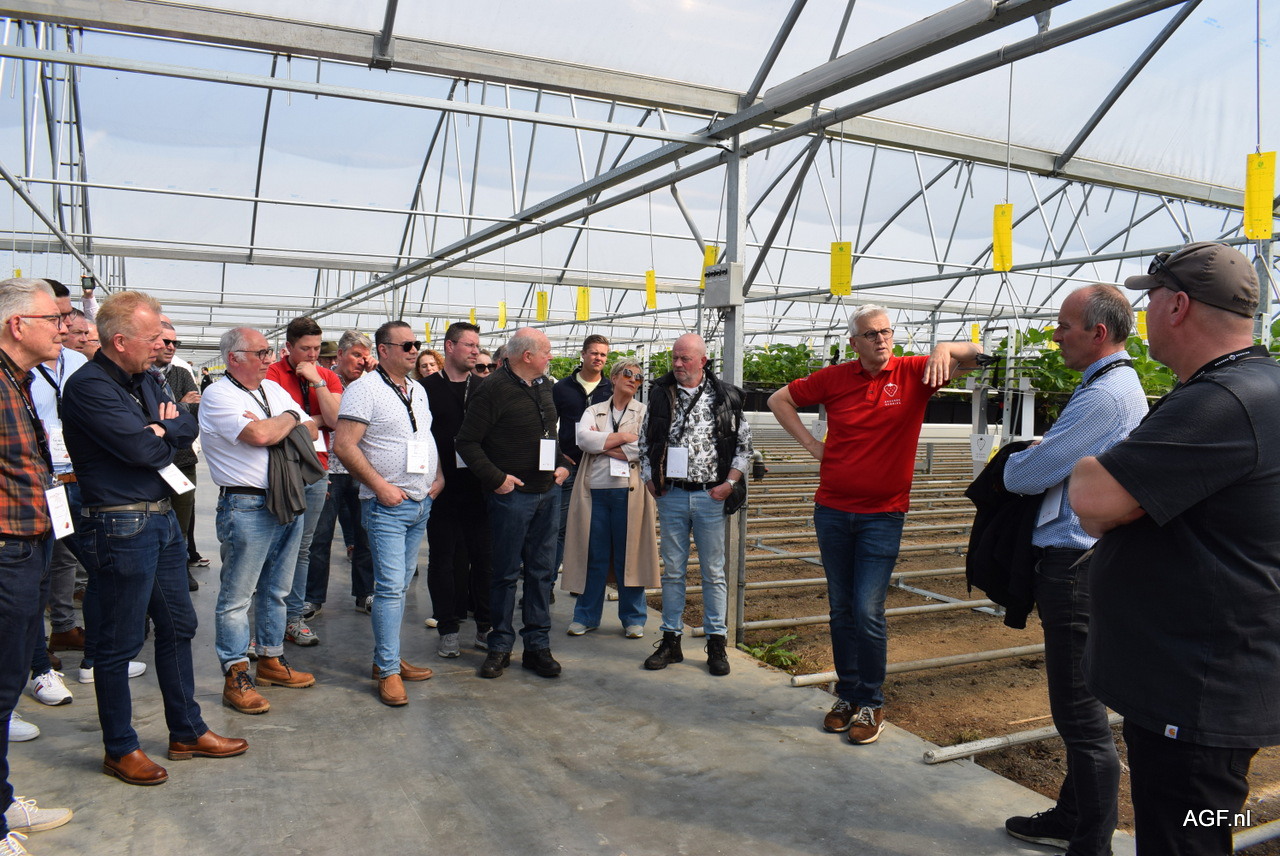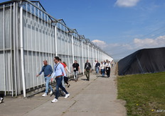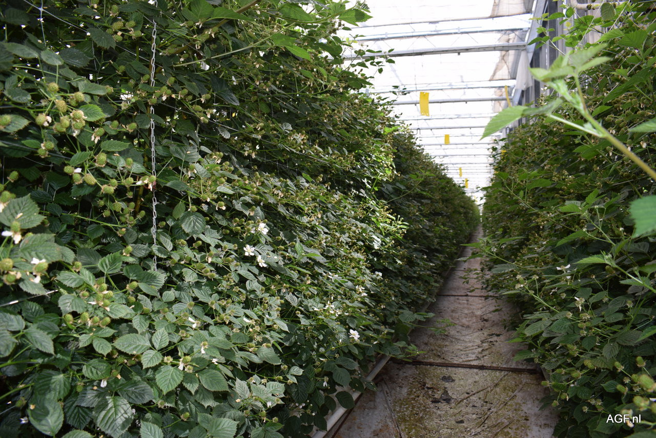Op naar de bramenkassen, de zwarte heuvel rechts is het waterbassin. Hierin wordt regenwater opgevangen voor de teelt.