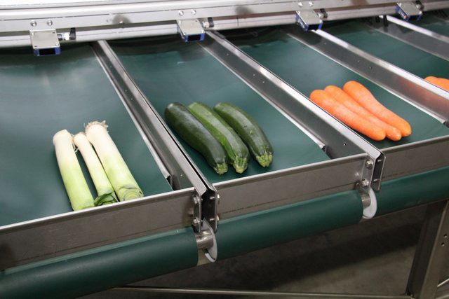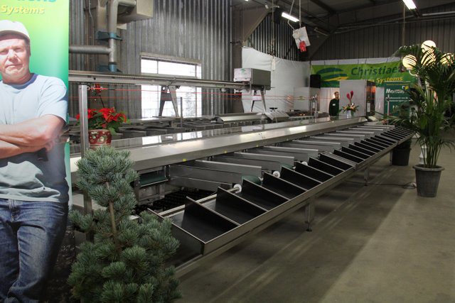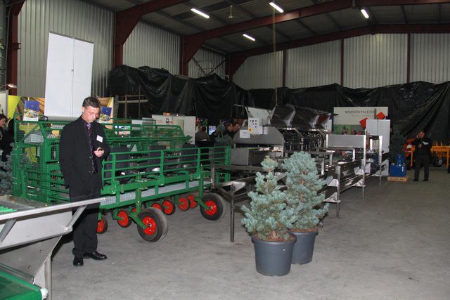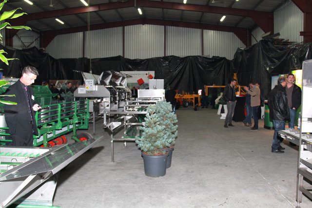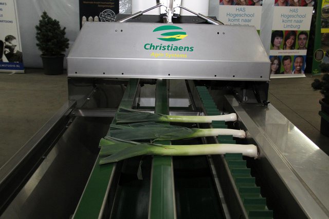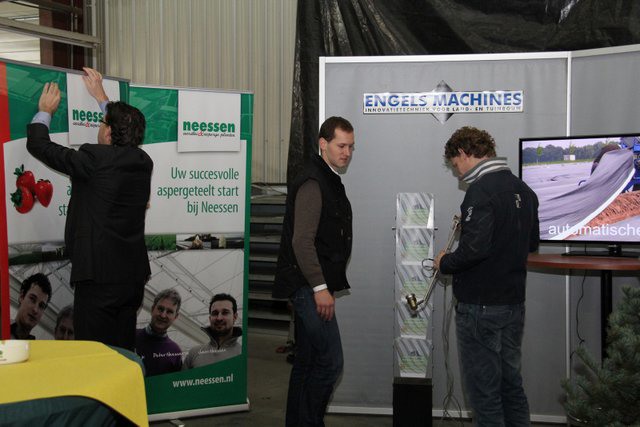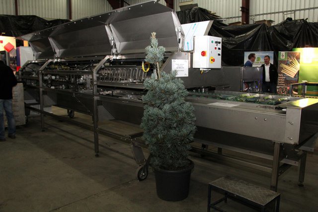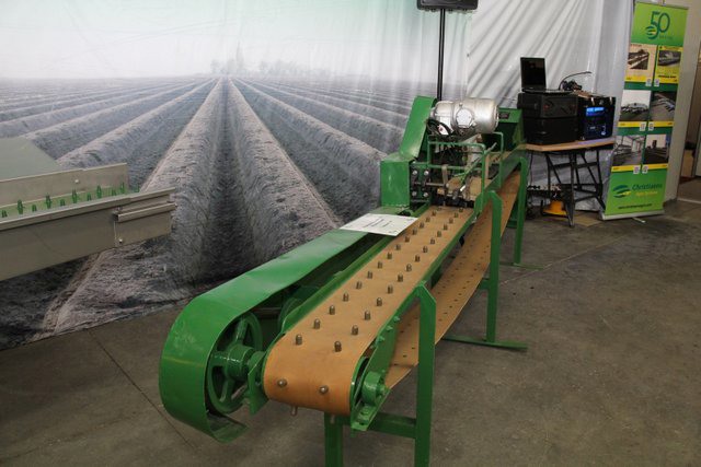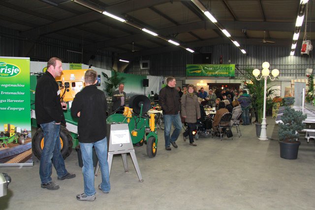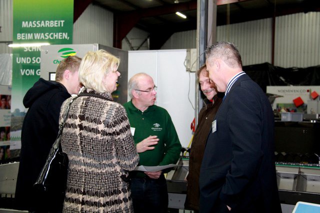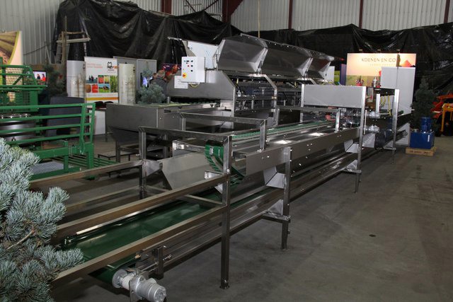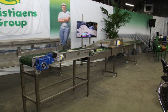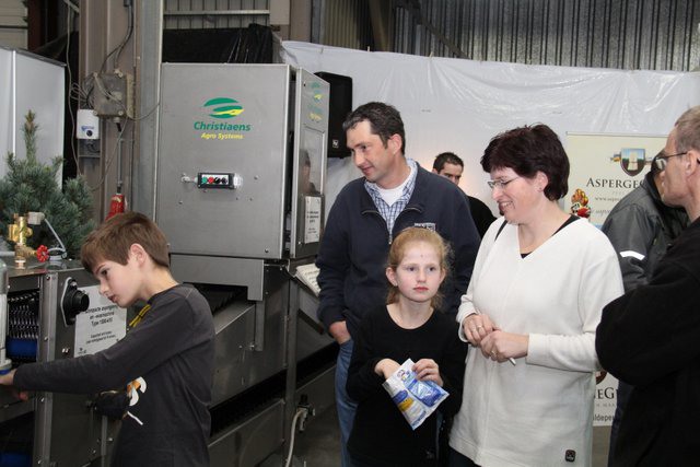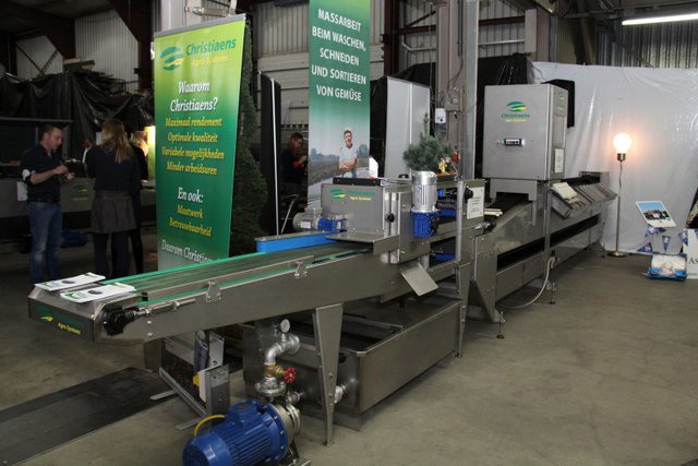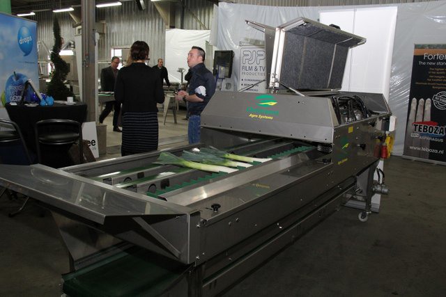 In de grote hal van het bedrijf waren de machines tentoon gesteld. Hier de compacte volautomatische aspergesorteerlijn.