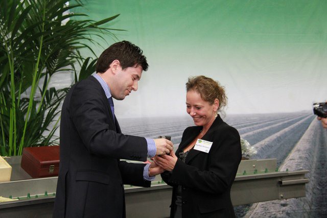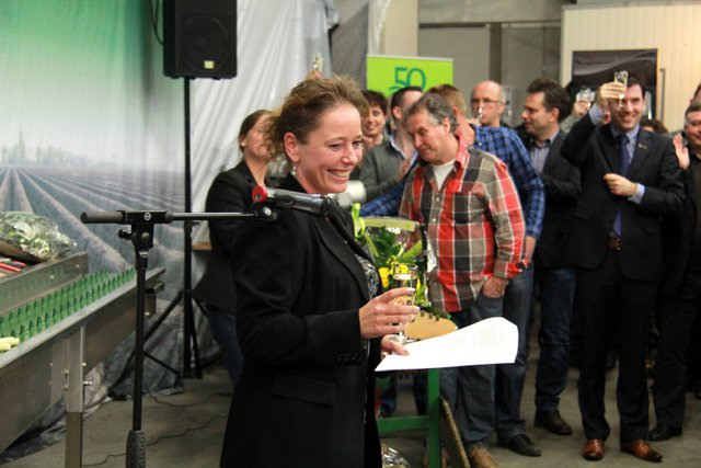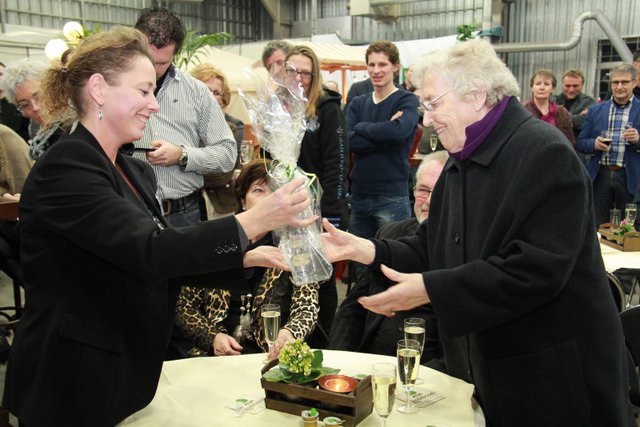 Dhr Minses, loco-burgemeester van de gemeente overhandigt aan Angelique Christiaens een glazen blok met het gemeentelogo van de gemeente Leudel en provincie Limburg erin gegraveerd. Hij vertelde trots te zijn om zo'n bedrijf in zijn gemeente te hebben.