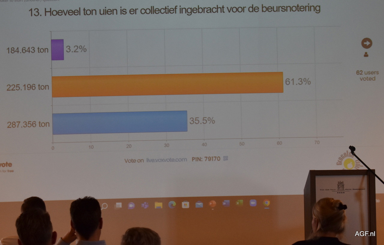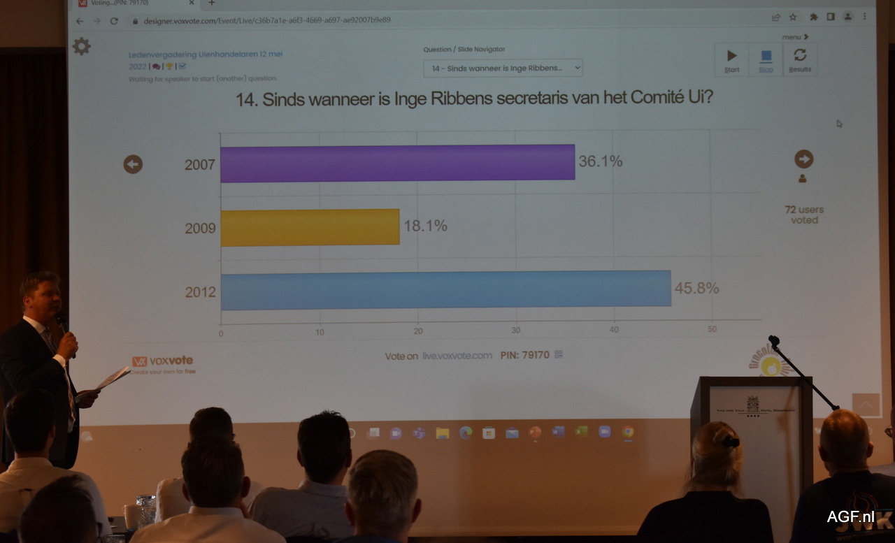 De jaarlijkse quiz zorgt voor een interactieve jaarvergadering. Diverse foto's geven de stellingen en antwoorden weer.