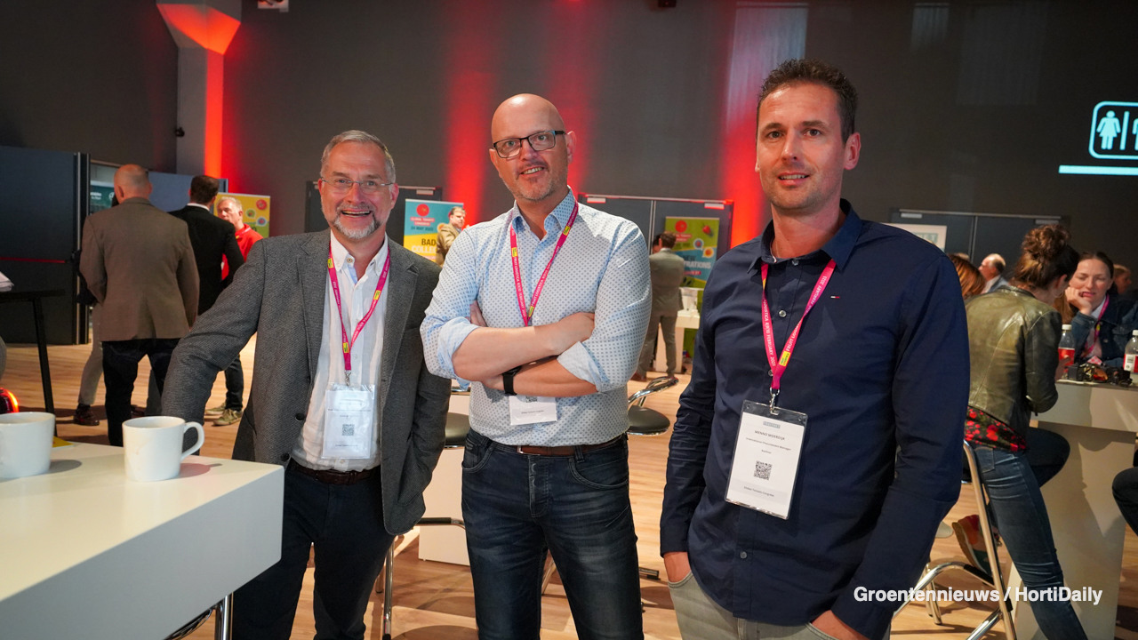 Renate Winsche en Marcel Prins van Syngenta met David Aubergier van Tomra.