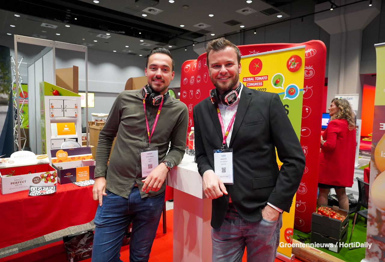 Edwin Vanlaerhoven en Fred van Veldhoven van Certhon. Naast hun cherrytomatenoogstrobot presenteert het bedrijf ook een totaalconcept voor de automatische teelt van cherrytomaten. Binnenkort meer.
